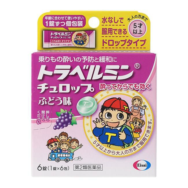 他の画像を見る 乗りもの酔いに 【第2類医薬品】 トラベルミン チュロップぶどう味 6錠 - エーザイ ※ネコポス対応商品 [乗物酔い/酔い止め] 定価 ¥ 521 販売価格 ¥ 484 税込 会員価格あり ネコポス便対応品 「トラベルミン チュロップぶどう味 6錠」は、乗りもの酔いによるめまい・吐き気などの症状を予防・緩和し、旅行やお出かけを快適で楽しいものにするためのお薬です。 詳細を見る お気に入りに登録する