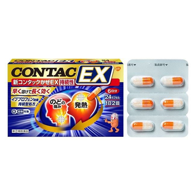 「新コンタックかぜEX持続性 24カプセル」は、かぜのつらい諸症状に効くイブプロフェン成分を配合。のどの痛み、発熱にピンポイントに効くほか、頭痛、関節の痛みにも、すぐれた効果を発揮します。ヨウ化イソプロパミドとd-クロルフェニラミンマレイン酸塩を配合し,とめたい鼻みずや鼻づまりをやわらげます。「先に効く」速放性の粒と「後に効く」徐放性の粒を配合したTTP(Tiny Time Pill)テクノロジーで,イブプロフェンの安定した効果が、朝・夕1日2回の服用で持続します。