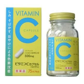 「ビタミンCカプセル 75P」は、酸味の強いアスコルビン酸を飲みやすくしたカプセルです。アスコルビン酸(ビタミンC)は野菜や果実の成分として自然界に存在する有機酸の一つで、皮下のメラニン色素に作用し、しみ、そばかすや日やけなどによる色素沈着を緩和します。アスコルビン酸は抗壊血病ビタミンとして知られるように、細胞をつなぐコラーゲン生成に必要なビタミンで、毛細血管壁を強化し、歯ぐきからの出血、鼻出血を予防します。