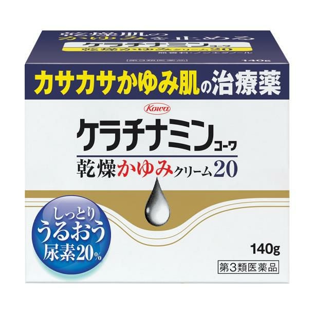 「ケラチナミンコーワ乾燥かゆみクリーム20 140g」は、かゆみを伴う乾燥性皮膚にすぐれた効きめをあらわすクリームタイプの治療薬です。保湿成分の尿素が体内の水分を集めてうるおいを保ち、肌保護ベール(基剤成分)が皮膚表面をしっとり包みます。かゆみを抑えながら保湿することでかゆみをくり返さない肌に改善していきます。ジフェンヒドラミン塩酸塩がかゆみをすばやく抑え、抗炎症成分のグリチルレチン酸が炎症を鎮めることにより、かゆみのもとの発生を抑えます。