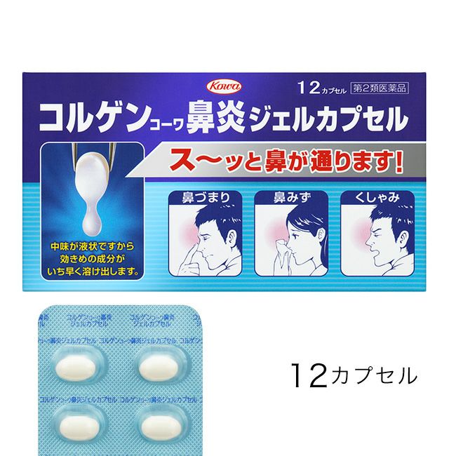 「コルゲンコーワ鼻炎ジェルカプセル 12カプセル」は、つらい鼻炎の症状にすぐれた効きめをあらわす5種類の有効成分を小さな一粒に閉じ込めました。 中味が液状の為、すばやく溶けてしっかり効きます。食後でなくても、症状がある時にいつでも服用できる便利なお薬です。