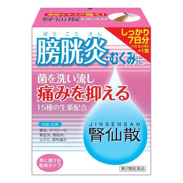 「腎仙散(ジンセンサン) 21包」は、抗炎症作用により、膀胱の粘膜を整えることで痛みを抑え、菌を弱らせて押し流し、膀胱を正常な状態にもどします。膀胱炎を繰り返す方におすすめです。