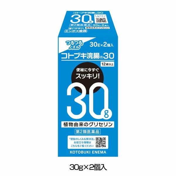 「コトブキ浣腸30 30g×2個入」は、12歳以上の大人用浣腸薬です。容器は一般的なイチジク型で手にフィットする柔らかな容器が特徴です。2~5分ですぐにスッキリ。一般的な便秘にはピッタリの浣腸薬です。エンボス容器を採用し、ノズルはツルツルで、ナチュラルカラー。