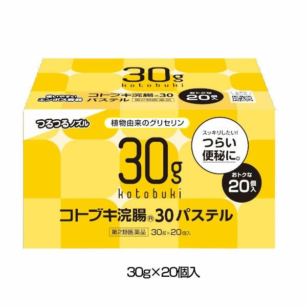 「コトブキ浣腸30パステル 30g×20個入」は、12歳以上の大人用浣腸薬です。容器は一般的なイチジク型で手にフィットする柔らかな容器が特徴です。エンボス容器を採用し、ノズルはツルツルで、ナチュラルカラー。お客様のご要望から生まれたかわいいパステルカラーのパッケージです。