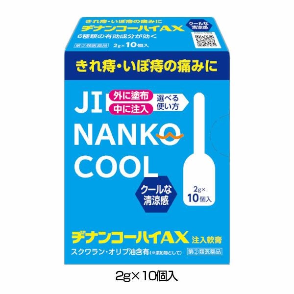「ヂナンコーハイAX 2g×10個入」は、切れ痔にもいぼ痔にも使える注入軟膏です。個包装になっているのでいつも衛生的に使え、持ち運びに便利です。切れ痔のような外の痔には患部に直接塗ってすぐに使えます。いぼ痔のような中の痔には、お尻に挿入し中の薬剤を押し出します。室温で保管できるため非常に便利です。かゆみ・痛み・出血など痔かなと思ったら。