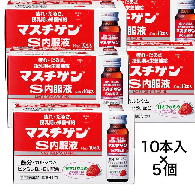 「マスチゲンS内服液 50ml×10本×5」は、鉄分・カルシウム・ビタミンB2・B6を配合した甘さひかえめのイチゴ味の栄養補給剤です。ホウレン草150gもしくは牛肉(サーロイン)約330g中に含まれる鉄分と同量の鉄を1本中に含みます。