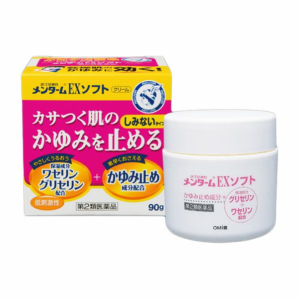 「近江兄弟社メンタームEXソフト 90g」は、かゆみ止め成分・ジフェンヒドラミン塩酸塩、リドカインがすばやくかゆみを抑え、グリチルレチン酸が肌の炎症を抑えます。さらに、低刺激性保湿成分が、かゆみやカサカサの原因である乾燥肌にうるおいを与え、トコフェロール酢酸エステルやパンテノールが血行をよくして、なめらかな肌へ導きます。