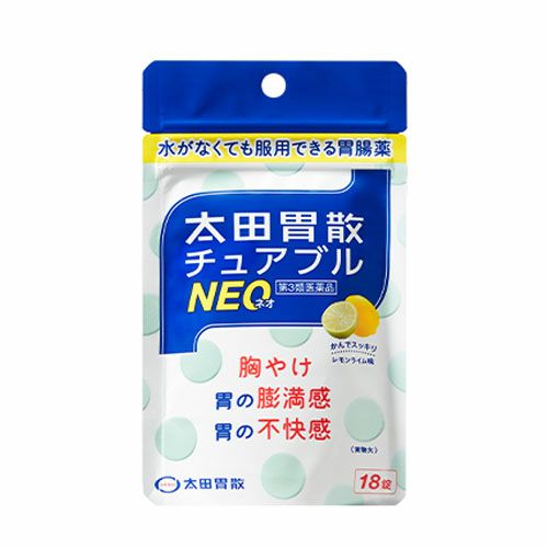 「太田胃散チュアブルNEO 18錠」は、水がなくても服用できるチュアブルタイプの胃腸薬です。かみくだくか、口の中でとかして服用するので、有効成分が患部に的確に作用し、効果的に胸やけを改善します。また、胃の膨満感・不快感にもよく効きます。外出先や職場などでの服用に大変便利。爽やかなレモンライム味。