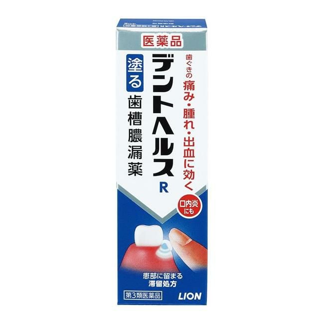 「デントヘルスR 40g」は、歯ぐきが腫れるなどつらい時に,指で患部に塗り込む塗布タイプの歯肉炎・歯槽膿漏薬です。4つの有効成分が歯ぐきの痛み・腫れ・出血といった歯肉炎・歯槽膿漏の諸症状を緩和。口内炎にも効きめがあります。有効成分がだ液に流されにくい滞留処方で、患部にしっかり留まり,すぐれた効果を発揮します。患部に塗りやすく、爽やかな使用感のゲルタイプです。