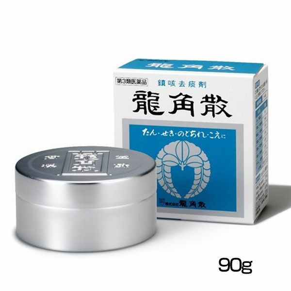 「龍角散 90g」は、鎮咳去痰作用を活発にする生薬(キキョウ・セネガ・キョウニン・カンゾウ)を主成分としたノドの薬です。 人間の気管の内面には、線毛細胞が一面にあり、その線毛は1分間に約1,500回の速さで絶えず振動し、また気管の内壁からは粘液を分泌しています。気道を通って来たチリやホコリ、細菌などはこの粘液にとり込まれ、線毛の振動によって体外に排出されます。これが自然の浄化作用です。 ノドの使いすぎや喫煙、汚れた空気を吸ったりするとノドが炎症を起して痛んだり、タンがからんだりして浄化能力がおとろえ、セキで苦しむことになります。こんなときに龍角散をのむと、キキョウ・セネガの有効成分サポニン配糖体が、気管内面からの粘液の分泌を高め、線毛運動を活発にして、タンをとり去り、セキを鎮め炎症をやわらげます。