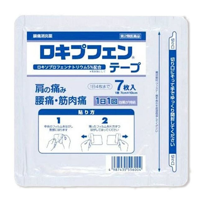 「ロキプフェンテープ」は、ロキソプロフェンナトリウム5%配合、痛みに浸透して効く、テープです。腰痛、肩こりに伴う肩の痛み、関節痛、筋肉痛、腱鞘炎に。7枚入り