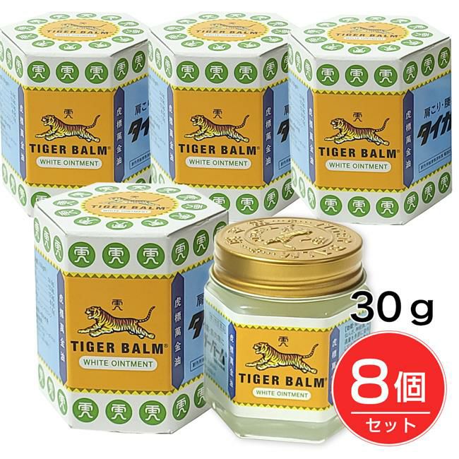「タイガーバームW 30g」はシンガポール虎豹兄弟国際有限会社で開発され、100年以上にわたってアジアを中心におよそ100の国々で販売されている、肩こり、腰痛、筋肉痛、筋肉疲労、うちみ、ねんざ、神経痛などのための外用消炎鎮痛剤です。すぐれた浸透性をもった軟膏タイプで、患部にぬると植物由来の生薬成分が皮膚からすみやかに吸収されて、血行を促進し、肩のこり、筋肉の疲れ、痛みに効果をあらわします。また、肩こりや筋肉痛の時は筋肉をもみほぐすことも効果がありますが、タイガーバームをマッサージするようによくすり込みますと、有効成分が浸透し、いっそう効果的です。 ★お得な8個セット