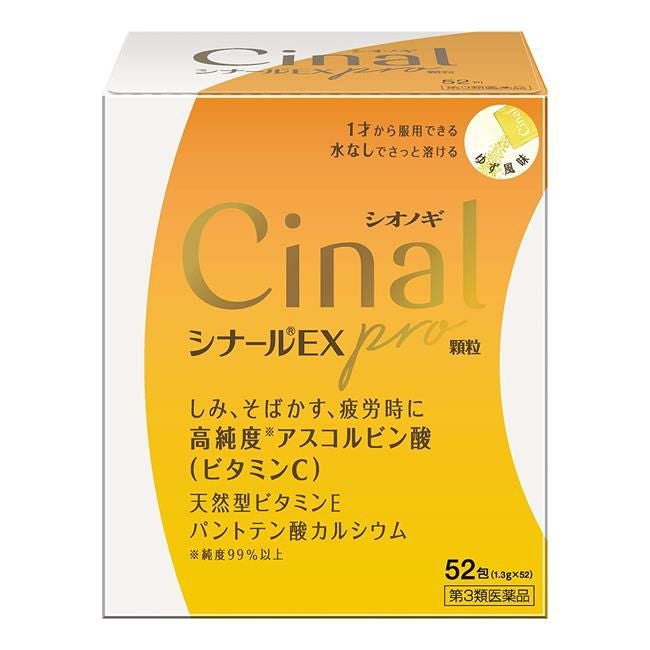 「シナールEX pro 顆粒 52包」は、ビタミンCの補給に適したビタミン剤で、口の中でさっと溶けるのみやすい顆粒です。またビタミンCとともに抗酸化作用をもつ天然型ビタミンE、皮ふの正常なはたらきをサポートするパントテン酸カルシウム、肌のすこやかなはたらきをサポートするビタミンB2を配合しています。