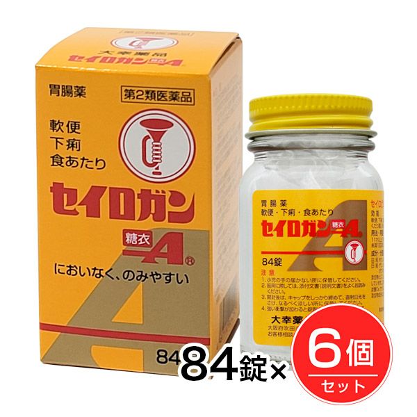「セイロガン糖衣A 84錠」は、100年以上前から使用されている正露丸の姉妹品で、ご家庭にて服用されている常備薬です。生薬である主成分の日本薬局方(日局) 木(もく)クレオソートは腸の運動を止めることなく、腸内の水分バランスを調整し、おなかを正常な状態に戻します。特に食あたり、水あたり、消化不良といった食べ物、飲み物が原因で起こる軟便、下痢、およびストレス、かぜなどの原因で起こる軟便、下痢にすぐれた効き目を発揮します。本剤は日局 木(もく)クレオソートをはじめ、ゲンノショウコ末およびオウバク乾燥エキスなどの生薬を配合した、においがなく飲みやすい白い錠剤です。 ★お得な6個セット