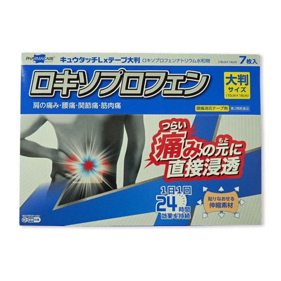 「キュウタッチLxテープ」は、鎮痛消炎効果のあるロキソプロフェンナトリウム水和物を配合した貼付剤です。有効成分の働きで、肩の痛み、腰痛、関節痛等の症状を改善します。伸縮性の高い高密度織布を使い、関節部位にもぴったりフィットします。 大判 7枚入