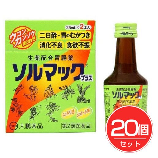 「ソルマックプラス」は、8種類の生薬に、胃腸機能を調整するカルニチン塩化物、ウコン、ニンジンを配合した生薬配合胃腸薬。二日酔・悪酔のむかつき、嘔気、悪心、嘔吐、消化不良、食べ過ぎ、食欲不振に効果があります。スッキリ感のあるメントール味。