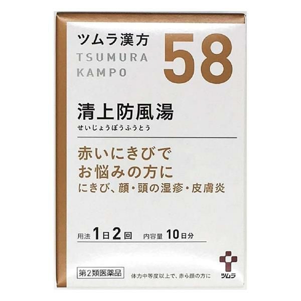 「ツムラ漢方 清上防風湯エキス顆粒 20包」は、脂っぽい肌にできる赤くとがったにきびにおすすめです。皮膚の炎症やかゆみ、痛みを抑え、化膿を鎮めます。にきびの他、顔面と頭部の湿疹、皮膚炎、あかはな(酒さ)に効果があります。