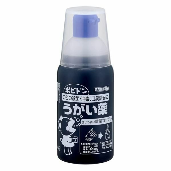 「ポビドンうがい薬」は、殺菌効果の高いポビドンヨードを有効成分としたうがい薬です。使いやすいワンタッチキャップ(ロック付)採用で、専用計量コップ付きです。かわいいキャラクターパッケージなので、うがいを嫌がるお子様にも人気です。