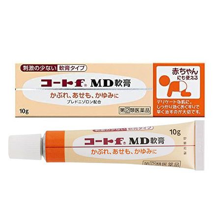 「コートfMD軟膏 10g」は、かぶれ、あせもなどの炎症にすぐれた効果のある合成副腎皮質ホルモン「プレドニゾロン」、炎症を抑える「グリチルレチン酸」がやさしく作用して、湿疹・皮膚炎などの炎症を鎮めます。赤ちゃんの薄くて薬剤の浸透しやすい皮膚にもお使いいただける無香料、無着色、防腐剤フリーの軟膏タイプの外用剤です。
