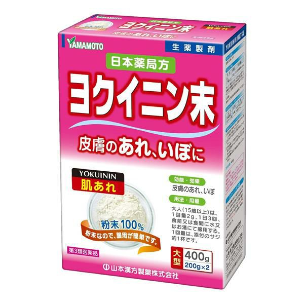 「ヨクイニン末大型 400g」は、ハトムギの種皮を除いたヨクイニンを粉末にしたもので、古くからお肌のために用いられてきた生薬です。消炎作用や体の水分バランスを整える作用があると言われ、肌あれや、いぼに効果がありおすすめです。