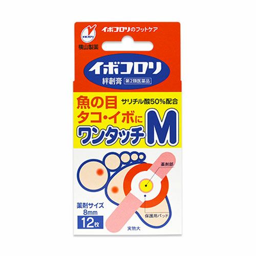 「イボコロリ絆創膏 ワンタッチM 12枚」は、サリチル酸の角質軟化溶解作用を利用した医薬品(角質剥離剤)です。厚く硬くなった皮膚をやわらかくし、魚の目・タコ・イボを取り除きます。薬剤部に粘着性があるので、患部に密着して有効成分サリチル酸の浸透効果を高めます。又保護用パッドが外部の刺激による患部の痛みをやわらげます。