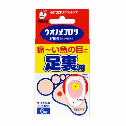 「ウオノメコロリ絆創膏 足裏用 6個」は、サリチル酸の角質軟化溶解作用を利用した医薬品(角質剥離剤)です。厚く硬くなった皮膚をやわらかくし、魚の目・タコ・イボを取り除きます。薬剤部に粘着性があるので、患部に密着して有効成分サリチル酸の浸透効果を高めます。又保護用パッドが外部の刺激による患部の痛みをやわらげます。