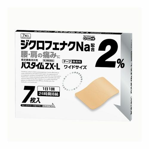 「パスタイムZX-L 7枚」は、ジクロフェナクナトリウムを2%配合したテープ剤です。1日1回で24時間効き続けます。微香性で、人前でも気になりません。ライナーが3ピース(中央剥離方式)ですので、はりやすい。