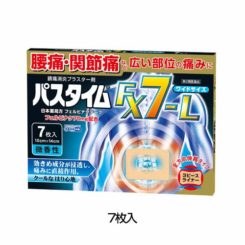 「パスタイムFX7-L 7枚」は、フェルビナクを1枚あたり70mg配合した鎮痛消炎プラスター剤です。フェルビナクは痛みに関係する物質(プロスタグランジン)の生成を抑え、肩・腰・関節・筋肉の痛みにすぐれた効き目をあらわします。腰など広い部位に適したワイドサイズです。微香性で、人前でも気になりません。基布はベージュ色で伸縮性にすぐれ、お肌によくフィットします。ライナーが3ピース(中央剥離方式)なので、はりやすい。