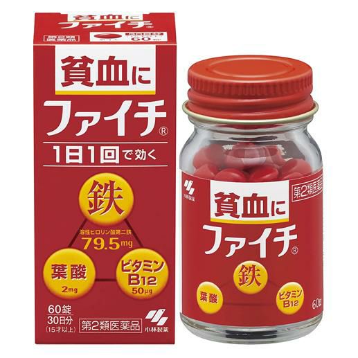 他の画像を見る 本気で治したい貧血に1日1回 【第2類医薬品】 ファイチ 60錠 - 小林製薬 [貧血用薬] 定価 ¥ 1,732 販売価格 ¥ 1,611 税込 「小林製薬 ファイチ 60錠」は、吸収のよい溶性ピロリン酸第二鉄を主成分とし、効果的にヘモグロビンを造り、貧血を改善します。 詳細を見る お気に入りに登録する
