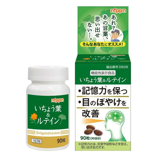 「ニップン いちょう葉&ルテイン 90粒 [機能性表示食品]」は、記憶力(言葉や図形を覚え、思い出す能力)を維持する機能が期待できイチョウ葉エキス、光の刺激から目を保護し、目のぼやけを改善する機能が期待できるルテインを配合した機能性表示食品です。