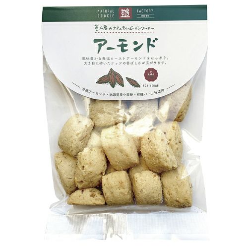 「ナチュラルビーガンクッキー アーモンド 80g」は、風味豊かな無塩ローストアーモンドをたっぷり生地にめり込みました。大き目に砕いたナッツの香ばしさが噛めば噛むほど口の中に広がります。おやつタイムにアーモンドの栄養も手軽に取れる人気のフレーバーです。