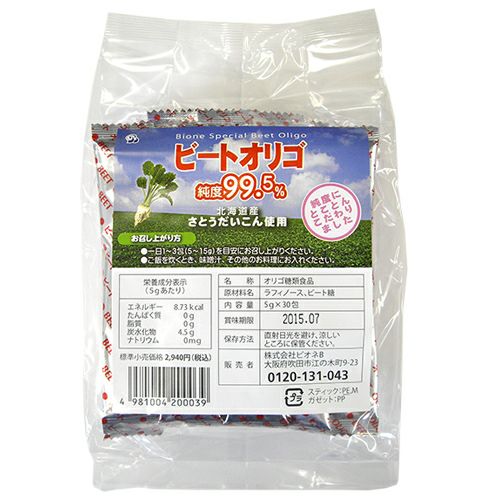 他の画像を見る ビートオリゴ 5g×30包 - ビオネ 販売価格 ¥ 3,240 税込 「ビートオリゴ 5g×30包」は、北海道産さとう大根(甜菜)から精製されるビートオリゴ糖(ラフィノース)を使用し、オリゴ糖成分を高めるために顆粒に加工する事で99.5%という高純度に仕上げました。 カートに入れる お気に入りに登録する