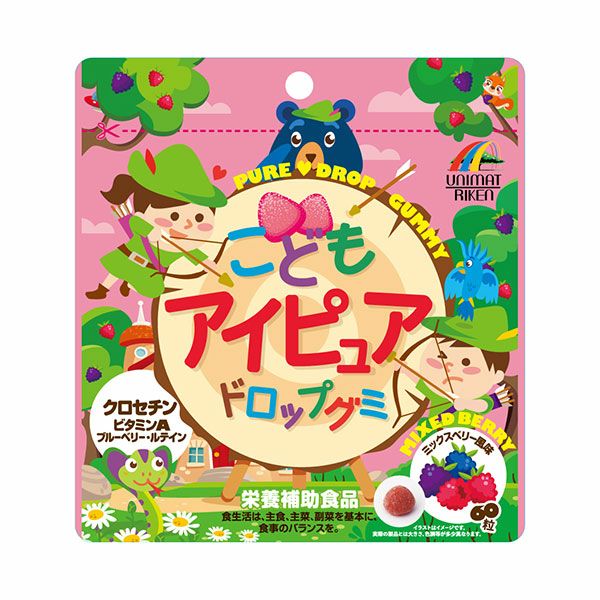 「ユニマットリケン こどもアイピュアドロップグミ 60粒」は、おいしいミックスベリー風味のアイピュアドロップグミです。お子様をはじめ、大人も安心して召し上がっていただける食べやすいサイズのグミに仕上げました。クロセチンに、ビタミンA、ブルーベリー、ルテインを配合。テレビやゲーム機などの画面を見る機会が多いお子様や、勉強を頑張るお子様におすすめです。