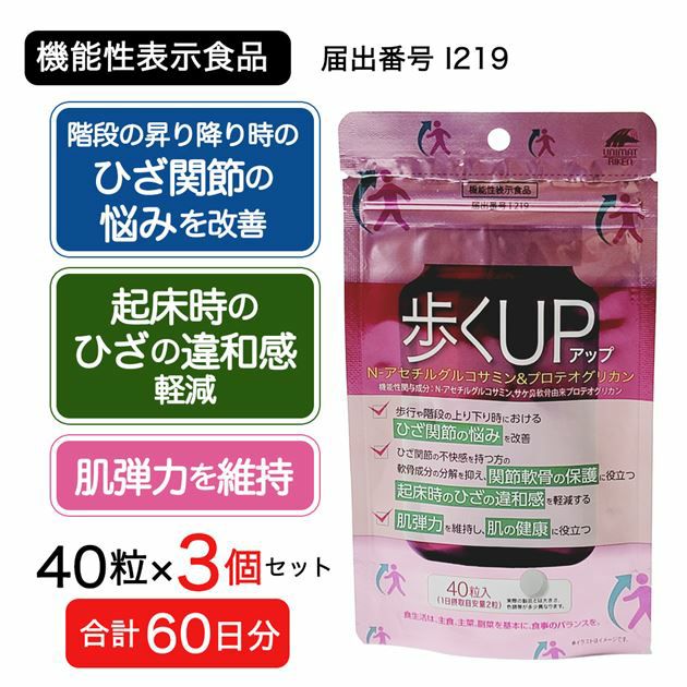 「ユニマットリケン 歩くアップ N-アセチルグルコサミン&プロテオグリカン 40粒」 は、はN-アセチルグルコサミン、サケ鼻軟骨由来プロテオグリカンを配合し、ひざのお悩みをサポートする機能性表示食品です(届出番号:I219)。