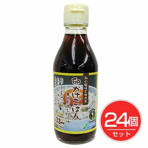 「卵かけごはん専用だししょうゆ 230g」は、 だしが効いた卵かけごはん専用のしょうゆです。本醸造の国産丸大豆しょうゆに雑穀系発酵調味液のナチュラルクックを使用し、かつお・昆布などこだわりのだし素材を最高の配合比でブレンドしました。卵の持つコクを引き立てる味わいに仕上がっています。化学合成調味料、保存料一切不使用。 ★お得な24個セット