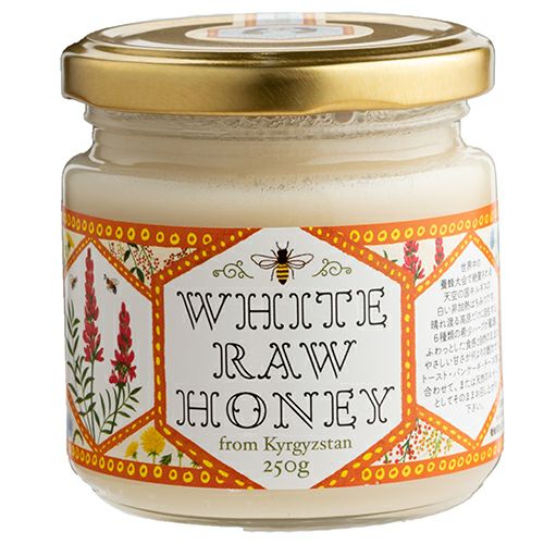 「キルギスの白いはちみつ 250g」は、標高2000m超の高原で自生する6種類のハーブから採集した白いはちみつです。ミルクのような独特の白さを持ち、濃く清らかでクリーミーな風味が特徴。過酷な自然を生きる生命力に溢れた蜜蜂が集めた、希少で極上の生はちみつです。