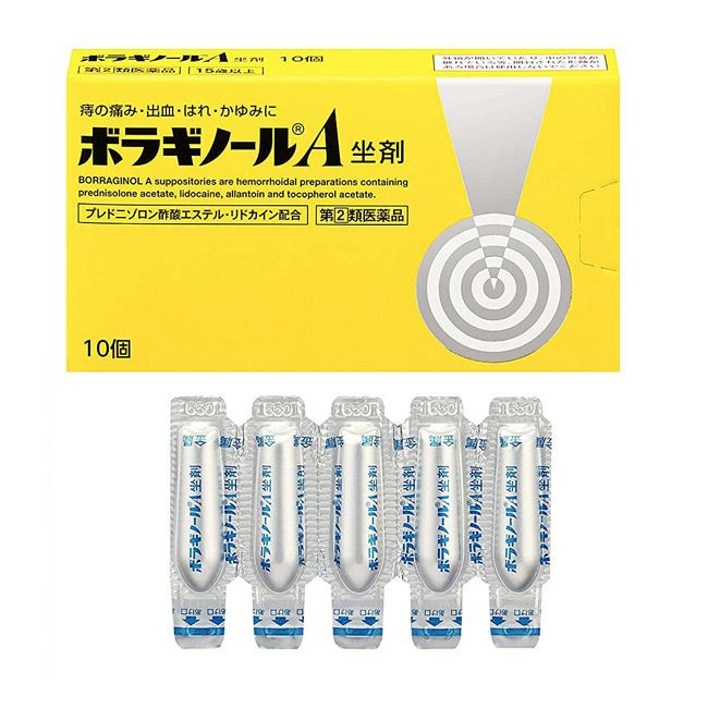 「ボラギノールA坐剤 10個入」は、4種の成分がはたらいて、痔による痛み・出血・はれ・かゆみにすぐれた効果を発揮します。 プレドニゾロン酢酸エステルが出血、はれ、かゆみをおさえ、リドカインが痛み、かゆみをしずめます。 アラントインが傷の治りをたすけ組織を修復するとともに、ビタミンE酢酸エステルが血液循環を改善し、痔の症状の緩和をたすけます。 刺激が少なく挿入しやすい油脂性基剤が傷ついた患部を保護し、スムーズな排便をたすけます。アルミシートに入った白色~わずかに黄みをおびた白色の坐剤です。