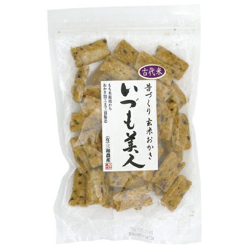 「古代米入り玄米おかき いづも美人 100g」は、うるち黒米のぷちぷちした食感が楽しめる黒米玄米おかきです。島根県産の有機もち米と古代米(うるち黒米)を使用し、玄米の旨みと程よい塩味のおかきです。