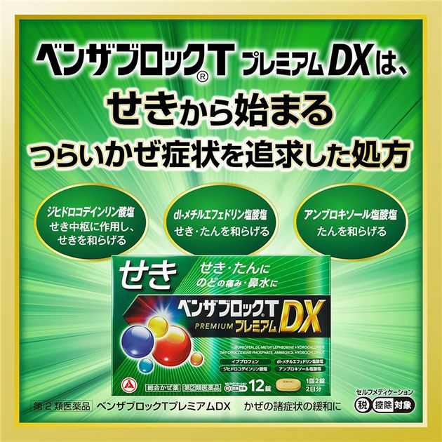 せき・たん・のどの痛み・鼻水に せきから始まるつらいかぜ症状を追求した処方 【指定第2類医薬品】 ベンザブロックTプレミアムDX 12錠 - アリナミン製薬 [セルフメディケーション税制対象] ※ネコポス対応商品 [風邪薬/せき]