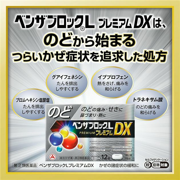 のどの痛み・せき・鼻づまり・熱に のどから始まるつらいかぜ症状を追求した処方 【指定第2類医薬品】 ベンザブロックLプレミアムDX 12錠 - アリナミン製薬 [セルフメディケーション税制対象] ※ネコポス対応商品 [風邪薬/のどの痛み]