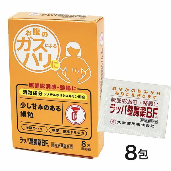 他の画像を見る おなかのハリにや便秘・軟便に [数量限定セール] ラッパ整腸薬BF 8包 《指定医薬部外品》 - 大幸薬品 [整腸/便通を整える] ※ネコポス対応商品 定価 ¥ 396 販売価格 ¥ 297 税込 ネコポス便対応品 「大幸薬品 ラッパ整腸薬BF 8包 《指定医薬部外品》」は、おなかがはる・ゴロゴロするなど日頃おなかのガスでお困りの方や便秘気味でおなかかがはるといった方におすすめです。 カートに入れる お気に入りに登録する