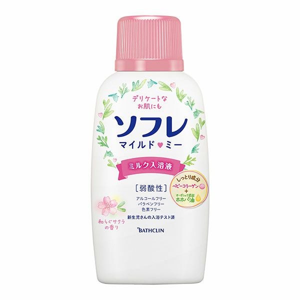 「ソフレ マイルド・ミーミルク入浴液 和らぐサクラの香り 720mL」は、保湿成分を配合した低刺激タイプのミルク入浴液です。赤ちゃんのお肌に多く含まれるといわれる3型コラーゲンや栽培から精製までこだわったしっとりオイル(オーガニック認証ホホバ油)などの保湿成分を配合。弱酸性。和らぐサクラの香り。湯色:ピュアホワイト色の湯(にごりタイプ )