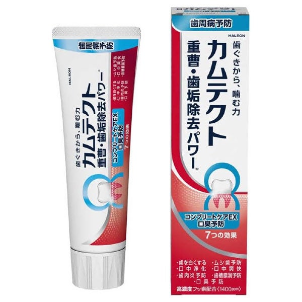 「カムテクト コンプリートケアEX 口臭予防 薬用ハミガキ 105g《医薬部外品》」は、健康な歯ぐきを保ち歯周病を予防、歯を強くしてムシ歯を予防する、オールインワンの歯周病 予防ハミガキです。息スッキリ、息キレイ、気になる口臭を防いで、お口のフレッシュな爽快感が続きます。