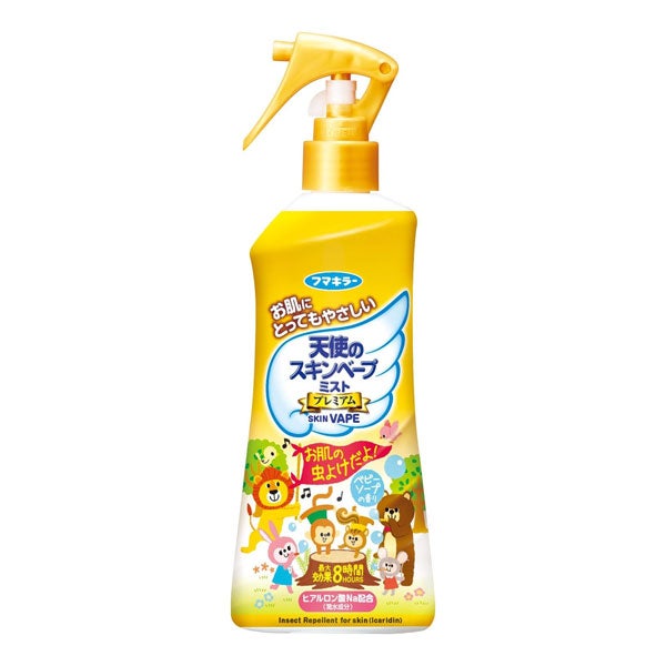 「フマキラー 天使のスキンベープミスト プレミアム イカリジン配合 200mL《防除用医薬部外品》」は、有効成分イカリジンの濃度を15%まで高めたことにより、虫よけ効果が長持ちします。お肌にやさしい潤水成分ヒアルロン酸Na配合。舞い散りが少なく、イヤなニオイもないので、虫よけを塗るのを嫌がるお子様でも気持ち良く使えます。ベビーソープの香り。