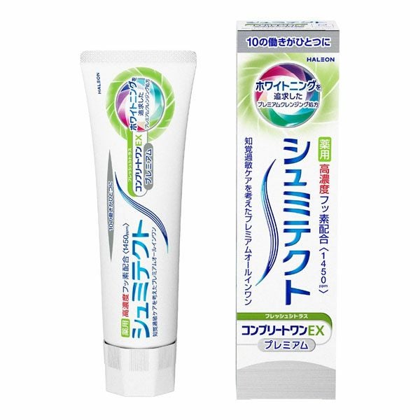 「アース製薬 シュミテクト コンプリートワンEX プレミアム フレッシュシトラス 90g《医薬部外品》」は、知覚過敏による歯のしみる症状を防ぐ働きを中心に、ホワイトニング、歯周病予防、ムシ歯予防など、複数の口内ケア機能をあわせ持つ薬用ハミガキです。球体状の微粒子清掃剤が歯の表面に配慮しながら汚れを落とす設計で、知覚過敏の方にも使いやすい処方です。従来品の機能に加えて、「口中爽快感」「タバコのヤニ除去」「歯垢除去(ブラッシングによる)」などの特長も取り入れ、これ1本でさまざまな口内ケアに対応できる仕様です。さわやかなフレッシュシトラス風味です。