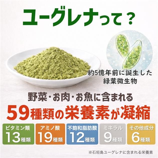 他の画像を見る 15年ぶりリニューアル新発売!石垣島ユーグレナ(ミドリムシ)600mgはそのままに、ユーグレナと米麹を発酵させた「活きた酵素を含むみどり麹」を新配合。八重山クロレラ・乳酸菌をプラス ユーグレナスマイルα 90カプセル - ココカラダ [石垣島ユーグレナ・みどりむしサプリ] [みどり麹/ユーグレナサプリ] ※ネコポス対応商品 定価 ¥ 4,860 販売価格 ¥ 3,980 税込 会員価格あり 送料無料 ネコポス便対応品 「ユーグレナスマイルα 90カプセル」は、15年にわたりご愛顧いただいてきた「ユーグレナスマイル」をベースに、発酵素材を新たに加えて進化したユーグレナサプリメントです。 詳細を見る お気に入りに登録する
