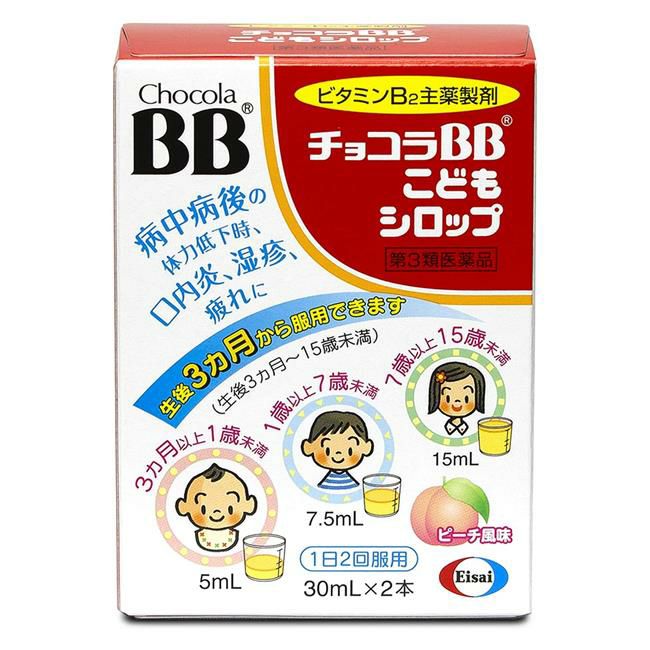 他の画像を見る 3ヵ月以上のお子様の病中病後の体力低下時、口内炎、湿疹、疲れに。 【第3類医薬品】 チョコラBBこどもシロップ 30ml×2本 - エーザイ [お子さまの口内炎/湿疹] 販売価格 ¥ 814 税込 「チョコラBBこどもシロップ 30ml×2本」は、ビタミンB2を主成分とし、ビタミンB1、ビタミンB6をはじめ、抗皮膚炎ビタミンとして知られているビオチンも配合した、お子様にさらっとした飲みやすいピーチ味のシロップ剤です。 詳細を見る お気に入りに登録する