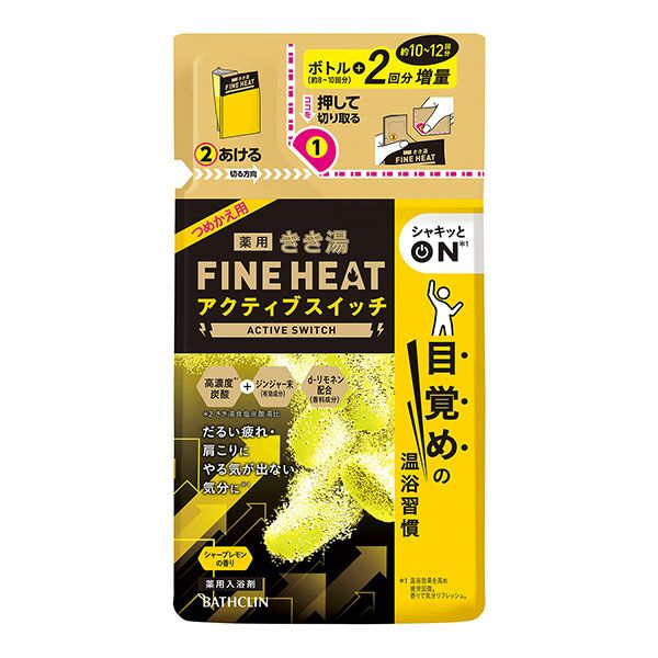 他の画像を見る 目覚めの温浴習慣 きき湯 ファインヒート アクティブスイッチ つめかえ用 500g 《医薬部外品》 - バスクリン 販売価格 ¥ 1,100 税込 在庫切れ 「きき湯 ファインヒート アクティブスイッチ つめかえ用 500g 《医薬部外品》」は、高濃度炭酸と生薬を組み合わせたプレミアムEX処方の薬用炭酸入浴剤です。 再入荷お知らせ お気に入りに登録する