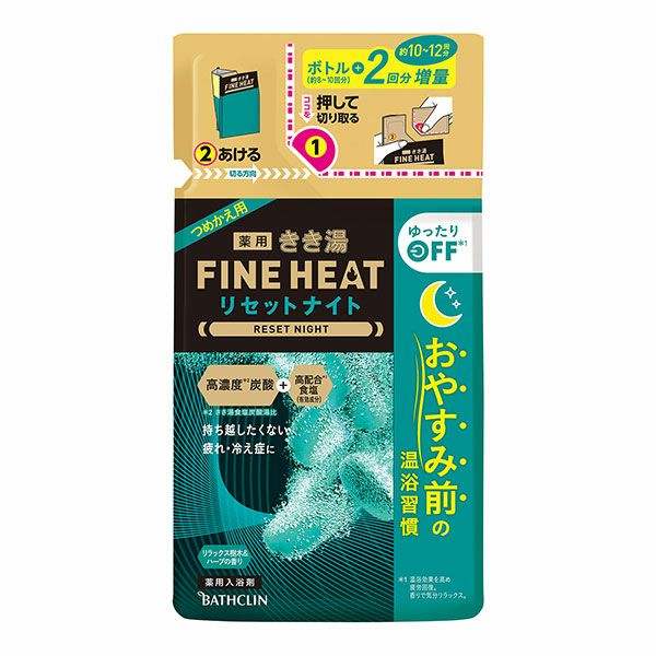 他の画像を見る おやすみ前の温浴習慣 きき湯 ファインヒート リセットナイト つめかえ用 500g 《医薬部外品》 - バスクリン 販売価格 ¥ 1,131 税込 会員価格あり 在庫切れ 「きき湯 ファインヒート リセットナイト つめかえ用 500g 《医薬部外品》」は、高濃度炭酸と生薬を組み合わせたプレミアムEX処方の薬用炭酸入浴剤です。 再入荷お知らせ お気に入りに登録する