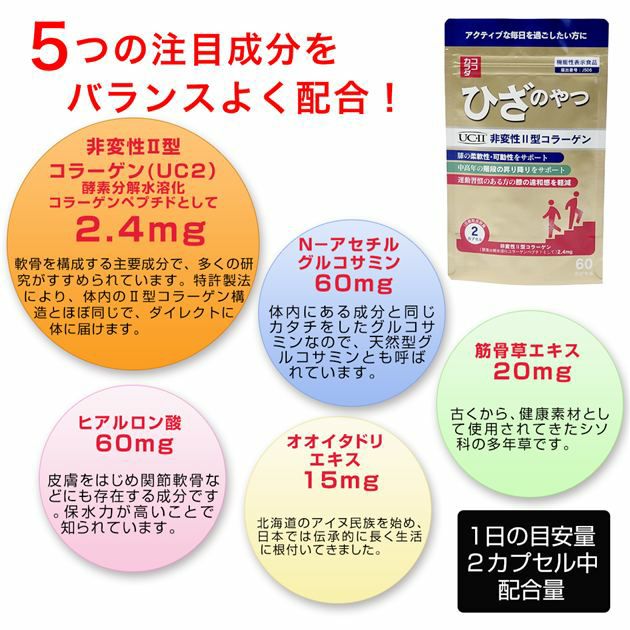 他の画像を見る 「ひざの違和感を軽減する」根拠データがあるから安心の機能性表示食品。UC-IIを40mg配合の非変性II型コラーゲン。膝関節サプリ 歩く、しゃがむ、階段の昇り降りサポート ココカラダ ひざのやつ 非変性2型コラーゲン UC-II [機能性表示食品] 60日分 60カプセル×2個セット - 健人 [ひざ関節/サプリ] ※ネコポス対応商品 定価 ¥ 8,640 販売価格 ¥ 7,560 税込 会員価格あり 送料無料 ポイント5倍 ネコポス便対応品 「ココカラダ ひざのやつ 非変性2型コラーゲン UC-II」は、機能性表示食品(届出番号 J506)として、ひざ関節の違和感の軽減し、柔軟性や可動性をサポートするサプリメントです。 詳細を見る お気に入りに登録する